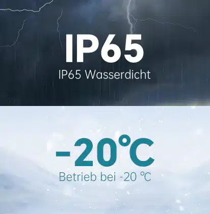 - Water- en stofbescherming volgens IP65. Kan dus zonder problemen buiten worden opgesteld.