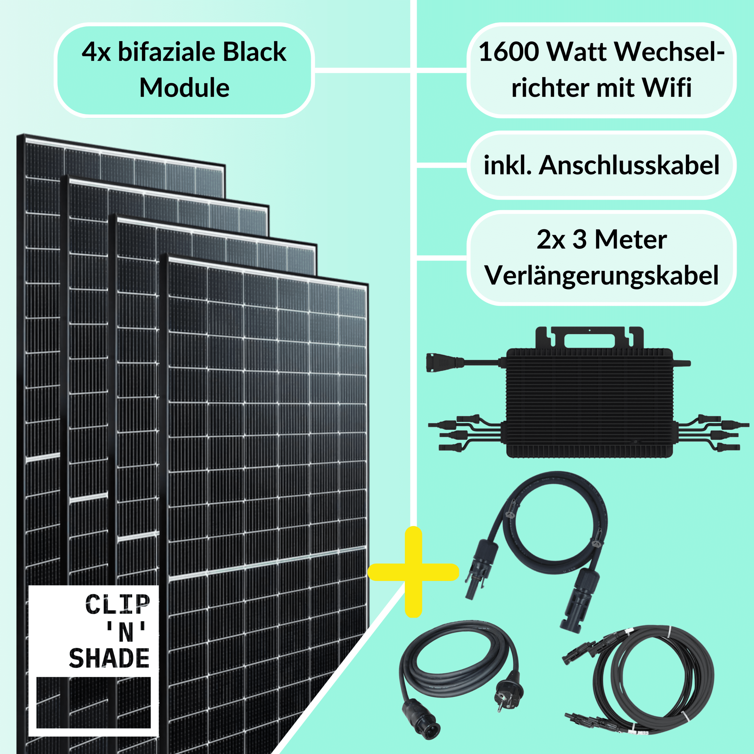 Bestaande uit 4x 430Wp Black modules en Hoymiles HMS-1600-4T omvormer + aansluit- en verlengkabel