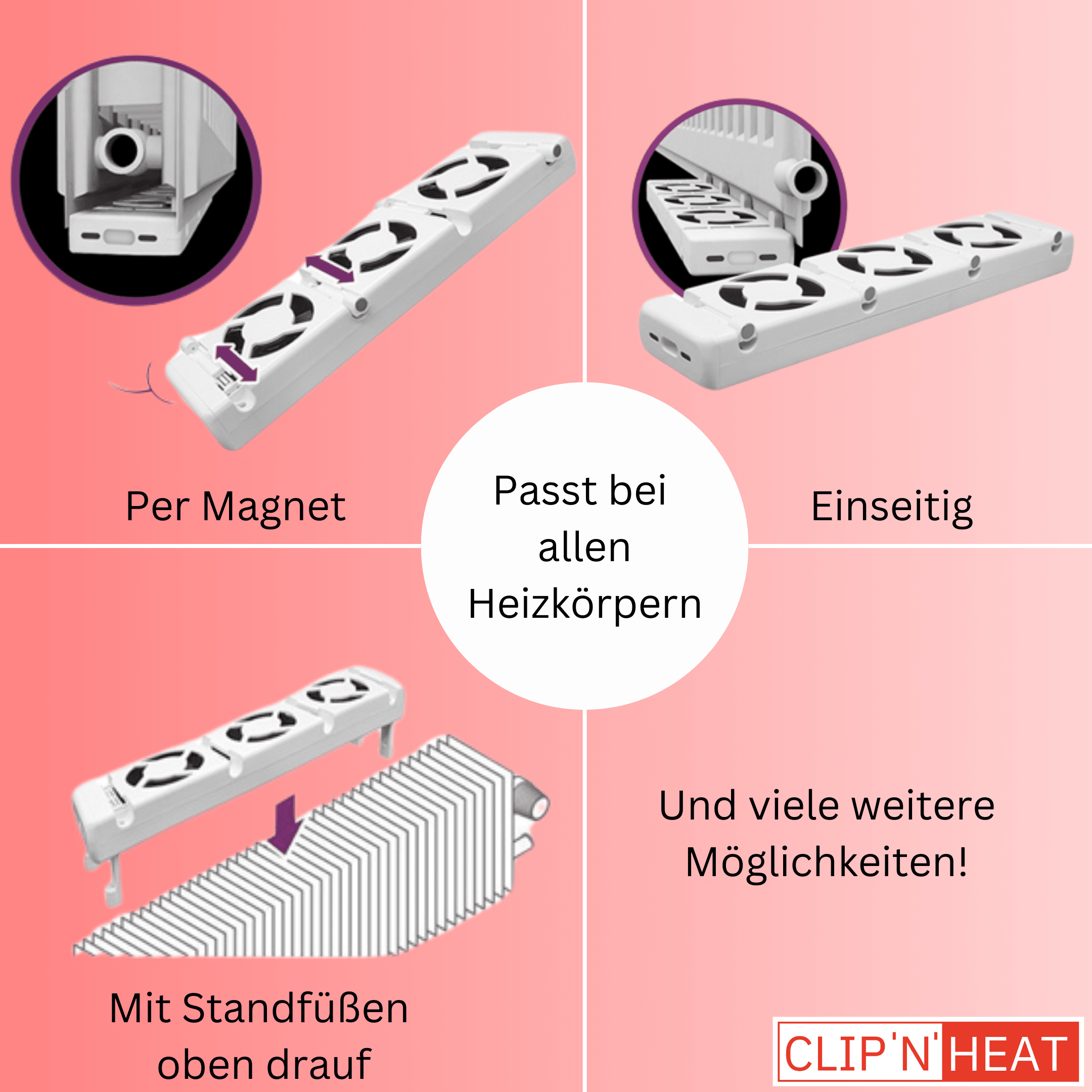 CLIP'N'HEAT versnelt de verwarming van je kamer, stelt je in staat om de thermostaat 1-2 °C lager te zetten en bespaart tot 22 % op verwarmingskosten. De eenvoudige installatie en stille werking maken het de ideale oplossing voor efficiënte verwarming en meer comfort in je huis. Verhoog de verwarmingsefficiëntie en geniet tegelijkertijd van een aangename kamertemperatuur - met de CLIP'N'HEAT radiatorventilator enkele set.