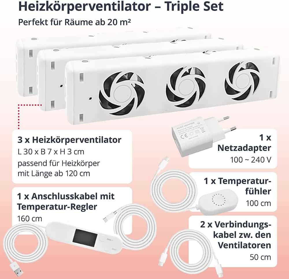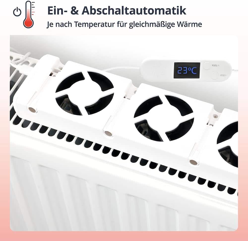 De CLIP'N'HEAT Double Set versnelt de verwarming van je kamers, stelt je in staat om de thermostaat 1-2 °C lager te zetten en bespaart tot 22 % op verwarmingskosten. De eenvoudige installatie en stille werking maken het de ideale oplossing voor efficiënte verwarming en meer comfort in uw huis. Met twee radiatorventilatoren in een set kunt u de verwarmingsefficiëntie maximaliseren en genieten van een aangename kamertemperatuur - dankzij de CLIP'N'HEAT radiatorventilator dubbele set.